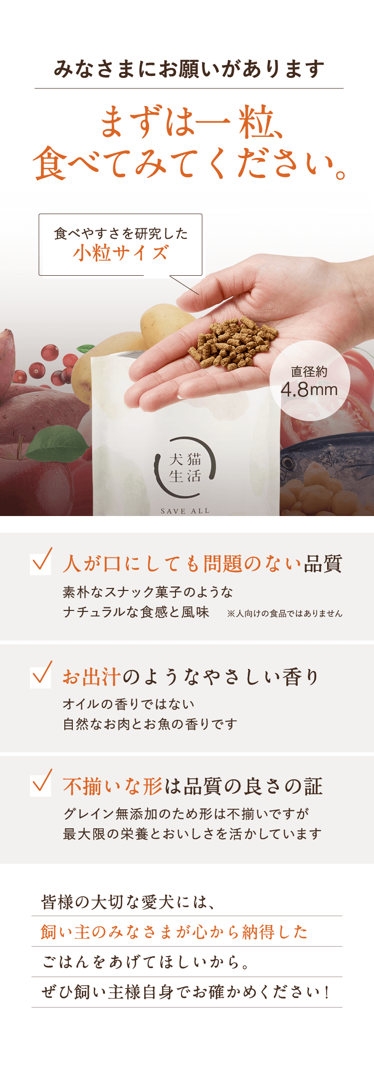 与える前に飼い主もフードを一粒食べてみたんですけど 犬猫生活ドッグフードはお魚の香りがします!優しい出汁っぽい感じ。 成分表示も包み隠さず、何故入れているかの記載があるので安心です◎X