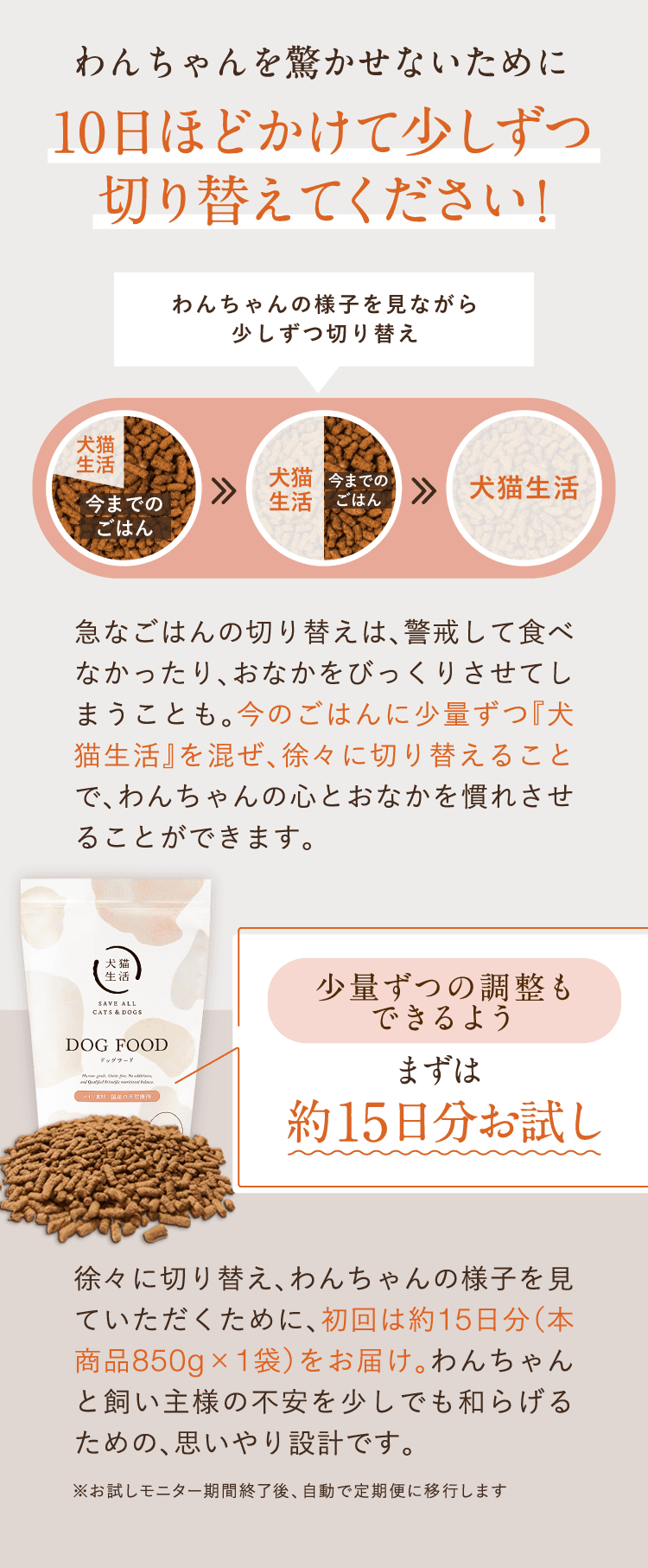定期コースは23%OFFになるうえ、トライアルサイズが届けられます。愛犬に合わなければ解約も可能なので、気になる方は公式サイトをチェックしてみましょう。