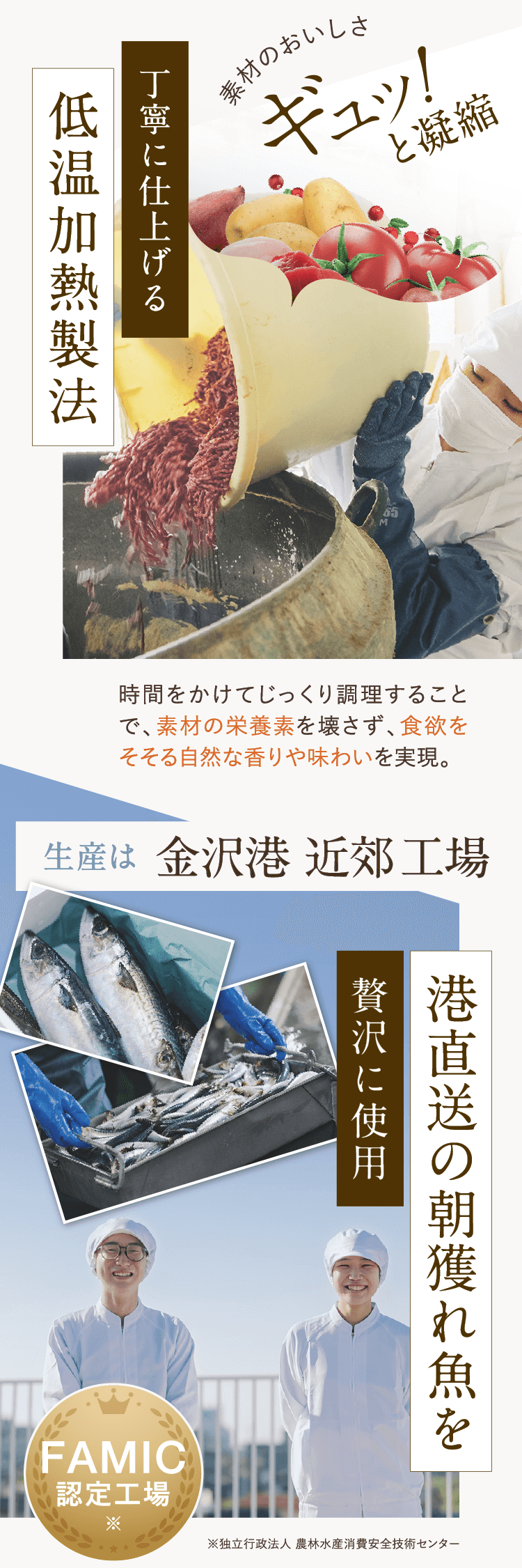 国産食材をメインに原材料は全て産地が公開され、生産工場もFAMICの厳しい基準をクリアした環境で生産されています。